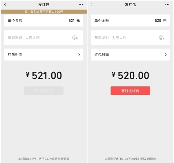 为了方便大家表达爱意,微信也开启了一年一度的限时520元大额红包,今天24点前都能发送520元红包。