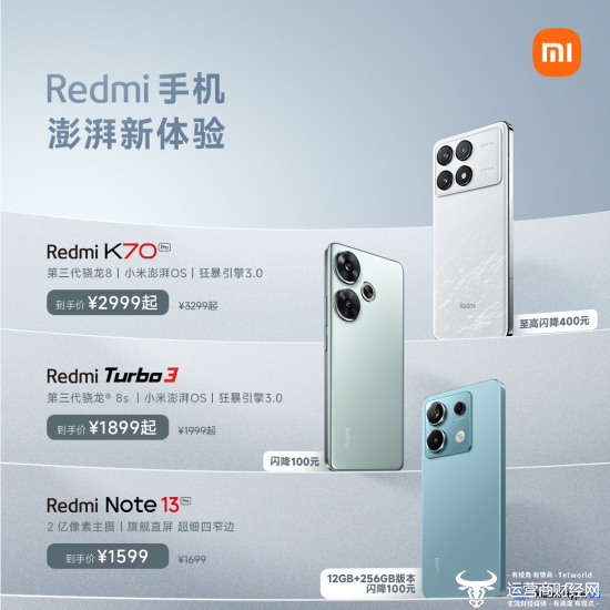 5月20日,小米宣布正式启动2024年618大促活动。这是小米汽车发布后的第一个618 活动,也是小米「人车家全生态」战略展开之年的首次618活动。不同于以往,本次小米 618 活动变得更简单了,没有预售,众多爆款产品价格闪降,现货直接开售。其中,Redmi Turbo 3全系闪降100元,Redmi K70全系闪降200元,Redmi K70 Pro更是至高闪降400元,小米 MIX Fold 3全系优惠1000元。