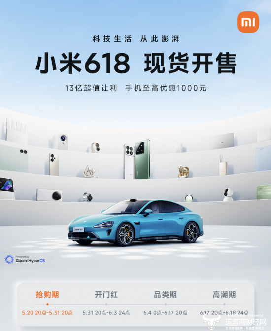 本次小米 618 科技焕新季大促活动主题是,“科技生活,从此澎湃”。小米通过13 亿超值让利,手机至高优惠 1000 元,拿出十足的诚意回馈消费者。整个小米 618 活动期间,共 4 个阶段。第一阶段抢购期(5 月 20 日晚 8 点到 5 月 31 日晚 8 点)、第二阶段开门红(5 月 31 日晚 8 点到 6 月 3 日 24 点)、第三阶段品类期(6 月 4 日到 6 月 17 日晚 8 点)和第四阶段高潮期(6 月 17 日晚 8 点到 6 月 18 日 24 时)。