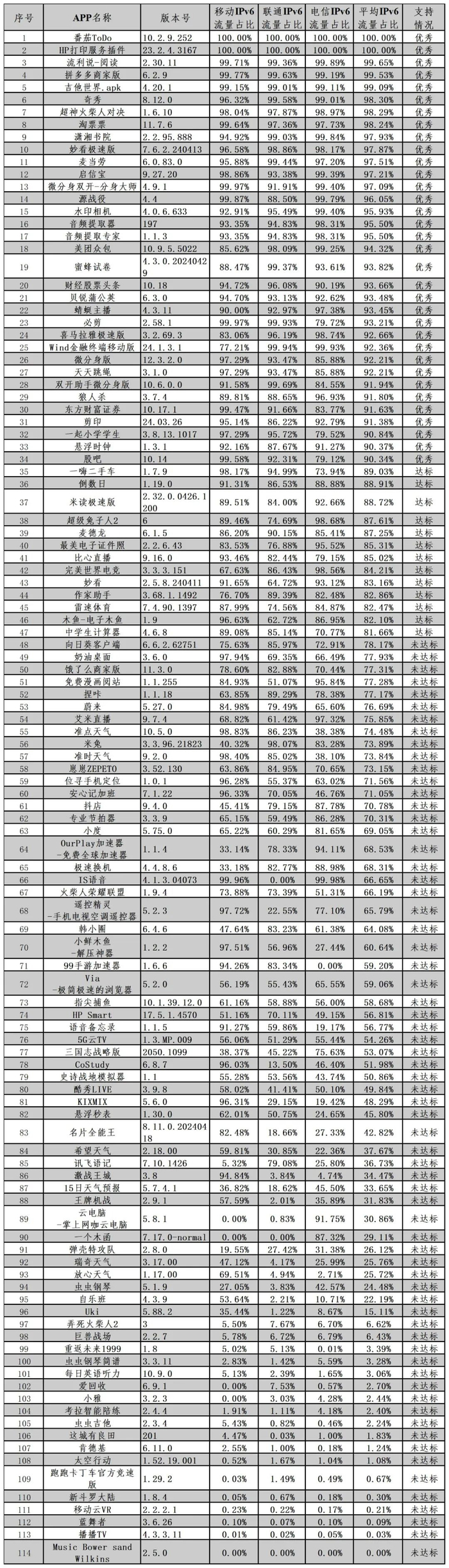 114款新增商业移动互联网应用(APP)IPv6流量测试情况