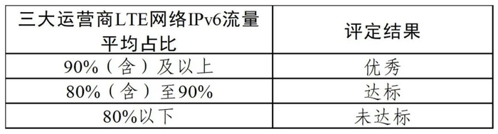 对移动互联网应用IPv6流量占比的测试覆盖中国电信、中国移动、中国联通等三大运营商的4G网络,测试终端为安卓系统手机,测试工具为半自动测试软件,测试结果反映用户在使用APP过程中基于IPv6的网络服务连通和流量占比情况。针对测试结果存在异常的数据,进行多轮次复测,并以稳定后的测试结果为准,相关评定标准如表2。