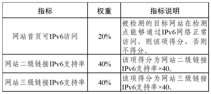 网站IPv6支持度分数根据网站首页可IPv6访问、网站二级链接IPv6支持率、网站三级链接IPv6支持率三个指标测试结果加权计算得出,得分高于95为达标,相关评定标准如表1。