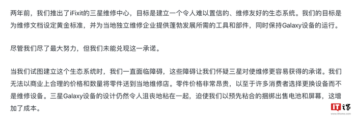 IT之家 5 月 24 日消息,在 iFixit 与三星合作即将届满两周年之际,近日 iFixit 发布新闻稿宣布“正在结束与三星公司之间的合作”,iFixit 透露,他们结束合作的原因是 “三星的维修方法与 iFixit 的使命不一致”,即“三星设备零件较贵,且手机难以维修”。