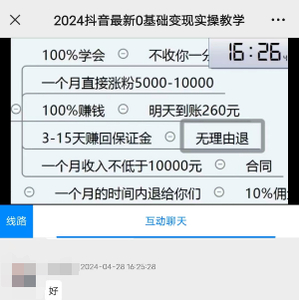 和筱绿相比,兰兰更像是被暗中盯上的。她甚至没有刷到过剪辑课、变现课推广,只是连续看了几场素人宝妈的直播。一个名为“抖加”的帐号就主动关注、私信并致电了兰兰,表示有免费的官方直播课可以听。起初兰兰也不信所以没听课,直到对面的“官方指导老师”发来一段略带恐吓的话语:系统检测到你未进入课堂学习,因此将在10分钟后对你的抖音帐号进行限流处理。