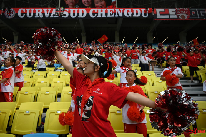 5月26日,2024中超联赛第14轮成都蓉城VS青岛西海岸比赛在成都凤凰山体育公园专业足球场“开战”。现场,一群朝气蓬勃的少年尤为引人注目,他们神色激动,眼中闪烁着对未来的憧憬与渴望,为运动员们和球迷们带来《我是未来》《少年有志》大合唱。