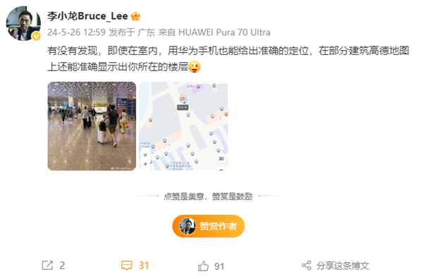 有了这个功能,即使在室内用华为手机也能给出准确定位,在部分建筑高德地图上还能准确显示出用户所在的楼层。