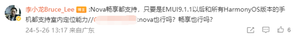 有网友询问李小龙:“nova也行吗?畅享也行吗”,李小龙表示,“nova畅享都支持,只要是EMUI9.1.1以后和所有HarmonyOS版本的手机都支持室内定位能力。”