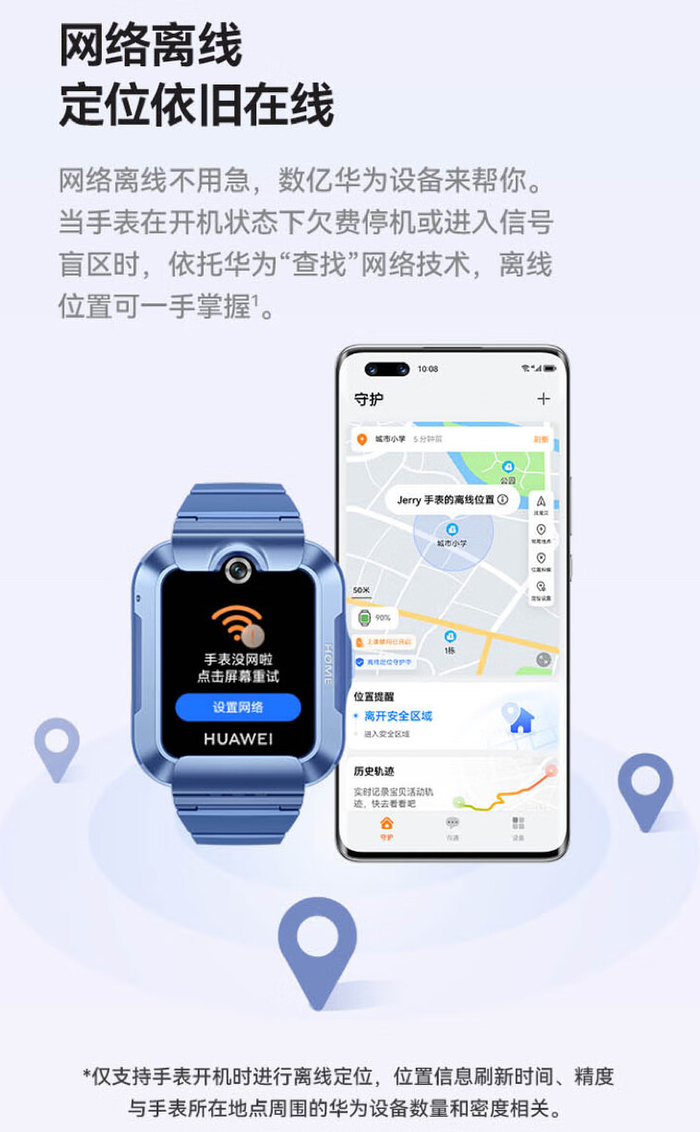 该手表支持离线定位:在开机状态下欠费停机或进入信号盲区时,依托华为“查找”网络技术可获取离线位置。