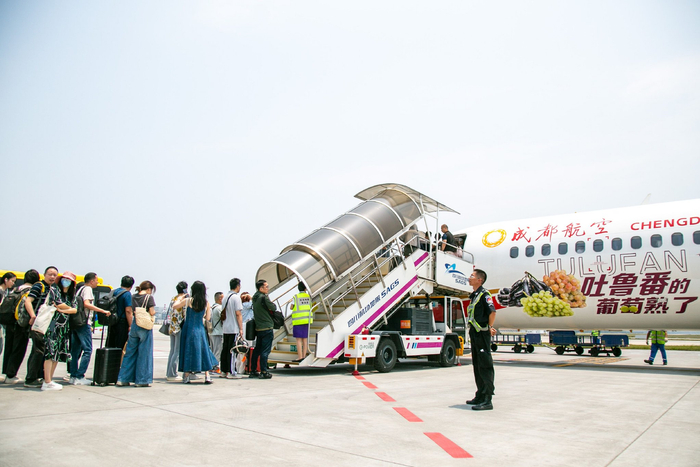 据介绍,这架大美新疆成都航空“吐鲁番号”飞机从成都天府国际机场出发,经停敦煌后到达吐鲁番。看机身,吐鲁番最负盛名的几个葡萄品种跃然其上,“吐鲁番的葡萄熟了”中英文字体与成都航空ARJ21飞机基础喷涂的飘带自然结合,整体效果生动有趣;走进飞机客舱,行李架、头片、小桌板上,随处都能看到吐鲁番相关元素。航班飞行中,成都航空还在客舱内组织开展了城市介绍、看图猜地名、听歌识曲等趣味互动活动。