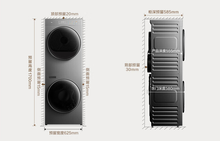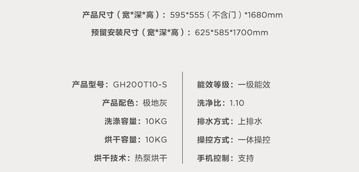据介绍,TCL GH200T10-S 整机厚度仅 555mm,支持微缝隙安装。桶径高达 580mm,洗涤容量 10kg,烘干容量 10kg,洗净比 1.10,上排水方式。