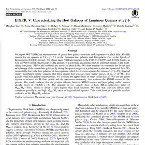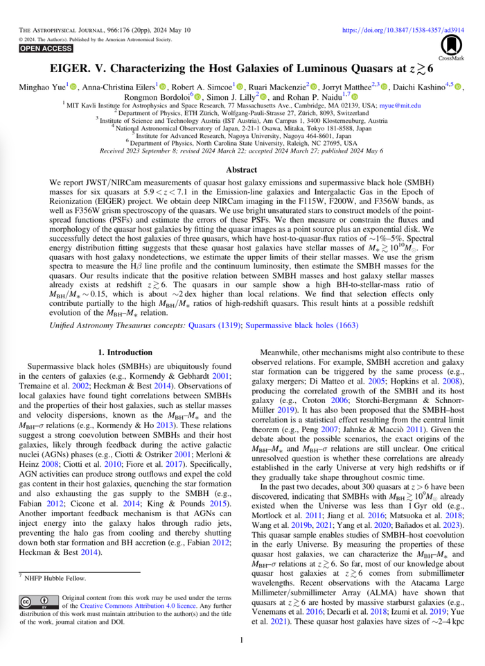 [1] Minghao Yue, Anna-Christina Eilers, Robert A. Simcoe, Ruari Mackenzie, Jorryt Matthee, Daichi Kashino, Rongmon Bordoloi, Simon J. Lilly, and Rohan P. Naidu. EIGER. V. Characterizing the Host Galaxies of Luminous Quasars at z ≳ 6. The Astrophysical Journal (2024). 966(2)