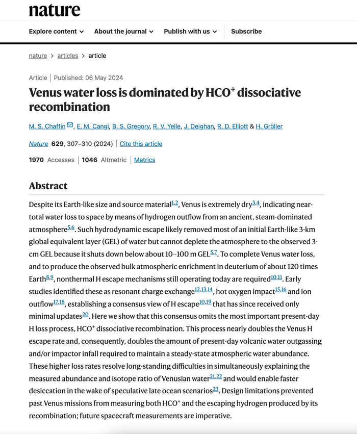 [2] Chaffin, M.S., Cangi, E.M., Gregory, B.S. et al. Venus water loss is dominated by HCO+ dissociative recombination. Nature 629, 307–310 (2024)