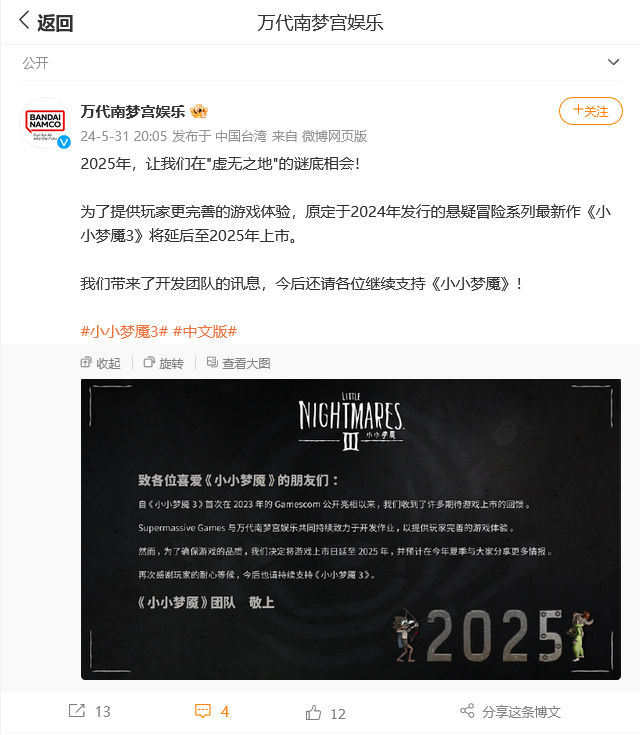 为确保游戏品质,《小小梦魇 3》宣布推迟至 2025 年发行