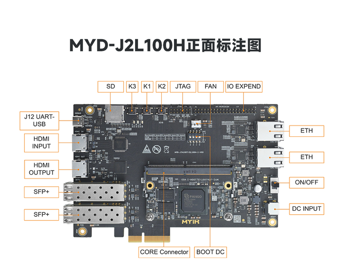 MYD-J2L100H开发板,采用12V/2A直流供电,搭载了2路千兆以太网接口、2路SFP+接口、1路PCIE2.0、1路HDMI输入、1路HDMI输出、1路摄像头、1路Micro SD接口、1路USB-UART接口、1路FAN接口及一路扩展口。