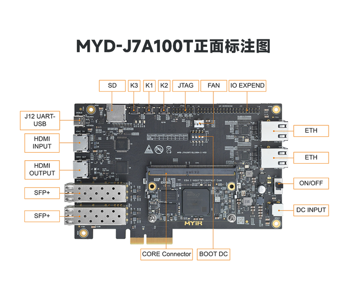MYD-J7A100T开发板,采用12V/2A直流供电,搭载了2路千兆以太网接口、2路SFP+接口、1路PCIE2.0、1路HDMI输入、1路HDMI输出、1路摄像头、1路Micro SD接口、1路USB-UART接口、1路FAN接口及一路扩展口。