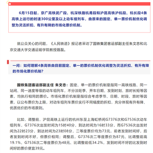 6月15日起,京广高铁武广段、杭深铁路杭甬段和沪昆高铁沪杭段、杭长段4条高铁上运行的时速300公里及以上动车组列车,由原来的固定、单一票价机制优化调整为灵活折扣、有升有降的市场化票价机制。