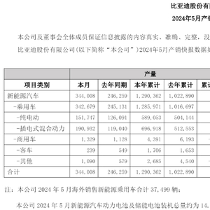 6月2日晚间,比亚迪(002594)发布5月产销快报。
