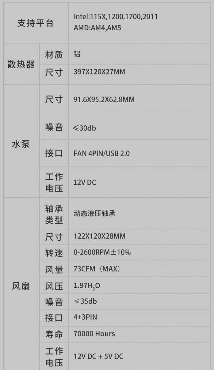 规格方面,该散热器尺寸为 397 x 120 x 27mm,拥有 20mm 厚度水道,采用全铝合金 CNC 上盖设计,配备 1 个 120mm 风扇,提供英特尔和 AMD 平台的背板和支架以及多种配件。