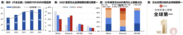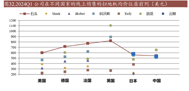 根据GFK数据,到2023年,中国品牌在海外扫地机器人市场的份额已达到75%,其中石头科技在2023年已成为全球扫地机销额第一,且在高端领域表现尤其突出,咱们国内品牌在不同国家均价都是靠前的。换句话说,在扫地机器人领域,国内品牌反而成了高端代名词,欧美本土品牌反而成了中低端。