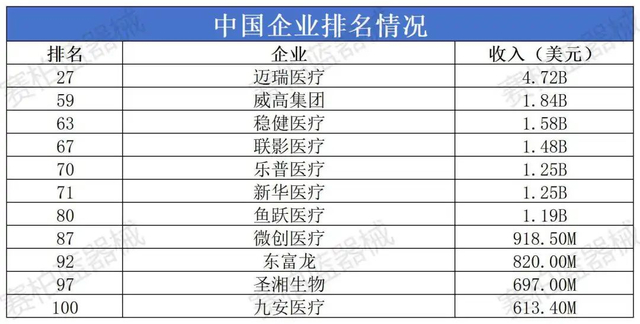 在2023全球Top100医疗器械企业榜单中,中国已经有11家企业上榜,榜首的迈瑞更是位列全球第27。
