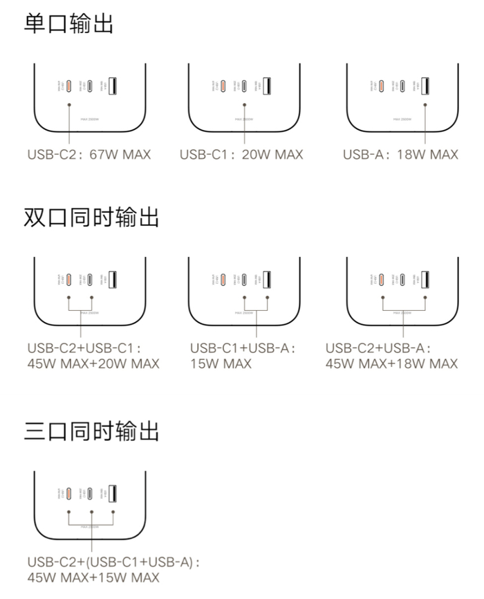 USB-C2 +(USB-C1 + USB-A):45W + 15W