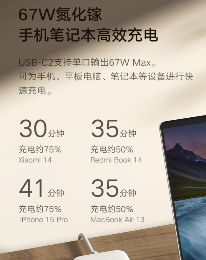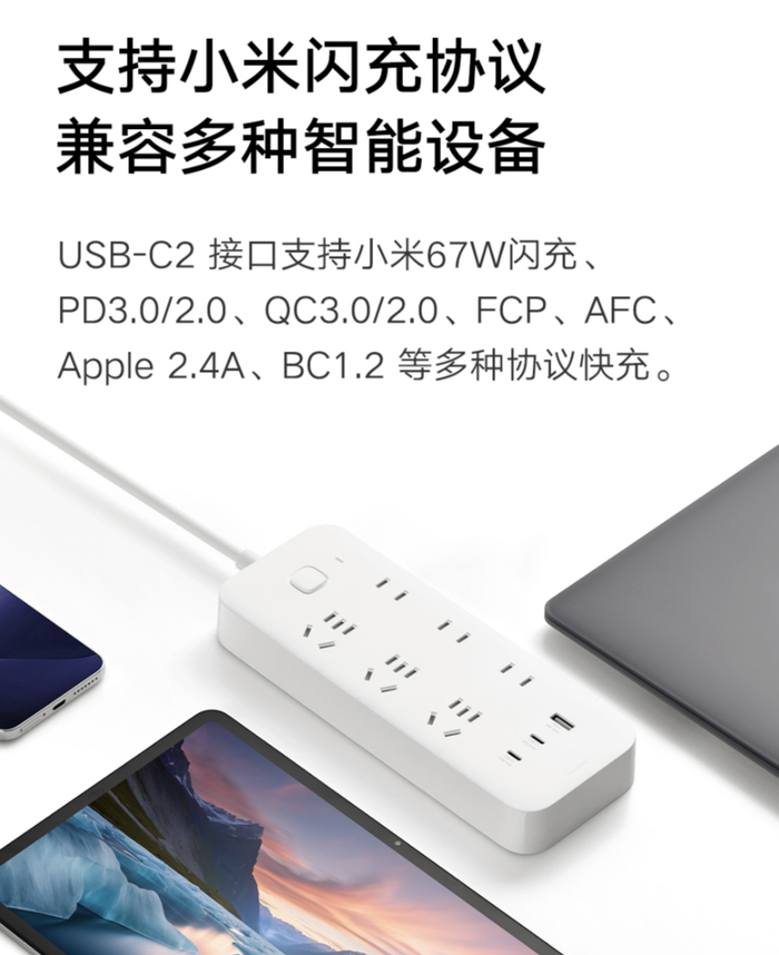 官方强调了这款插线板的 USB-C2 接口,该接口单口输出至高 67W,支持小米闪充协议,同时兼容 PD 3.0、QC3.0、FCP、AFC、Apple 2.4A、BC 1.2 等协议。