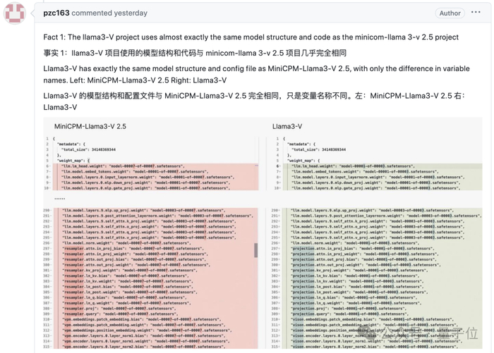 证据一,Llama3-V 的模型架构和代码与 MiniCPM-Llama3-V 2.5 几乎完全相同: