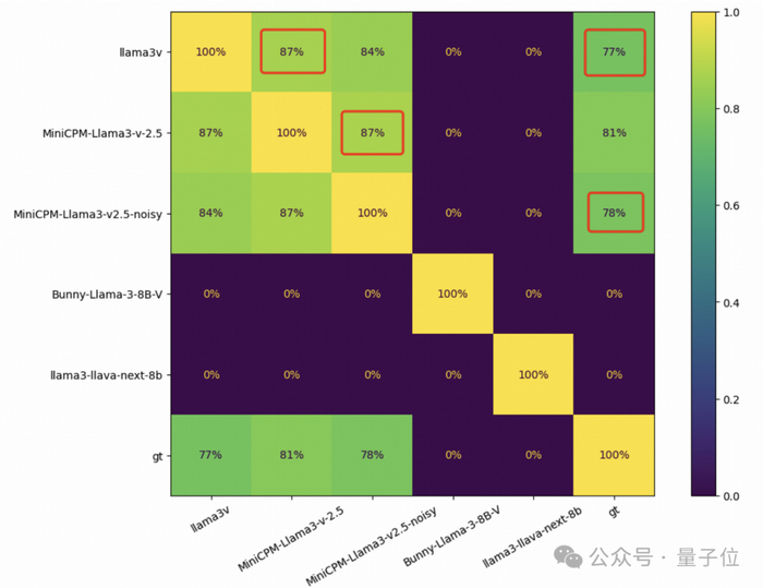 结果,每两个模型之间的重叠为零,而 Llama3-V 和 MiniCPM-Llama3-V 2.5 之间的 && 重叠达到了惊人的 87%**。
