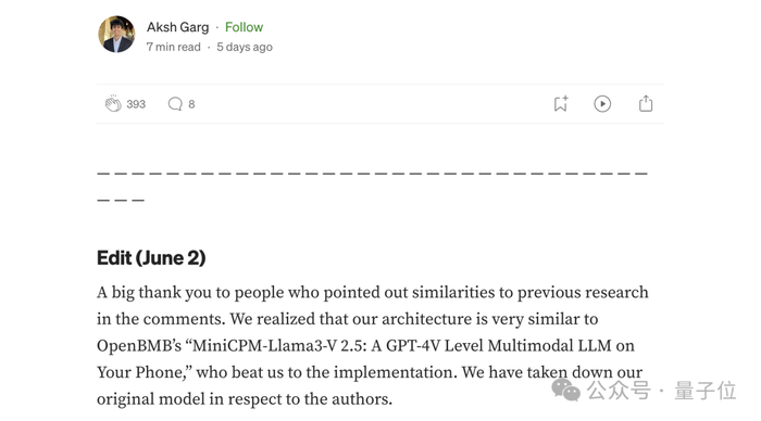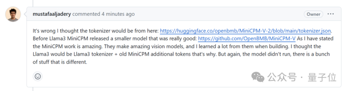 例如他们强调,Llama3-V 这项工作的时间是要早于面壁智能的 MiniCPM,只是使用了他们的 tokenizer。