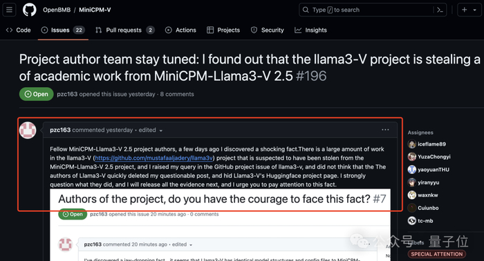 正如刚才所述,一个网友爆料 Llama3-V 抄袭 MiniCPM-Llama3-V 2.5,跑到面壁智能的 GitHub 主页提醒团队注意,并把关键证据都一一截图列举整理了下来,这才有了整个抄袭门的还原现场。