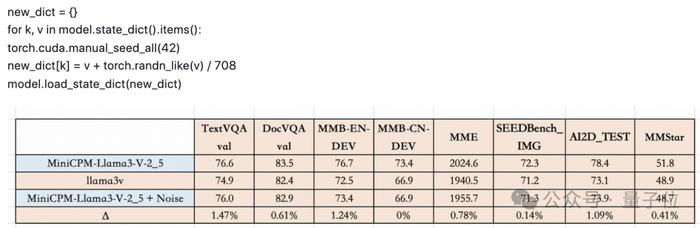 此外,如果将高斯噪声(由单个标量参数化)添加到 MiniCPM-Llama3-V 2.5 的 checkpoint,结果就是会得到一个行为与 Llama3-V 极其相似的模型。