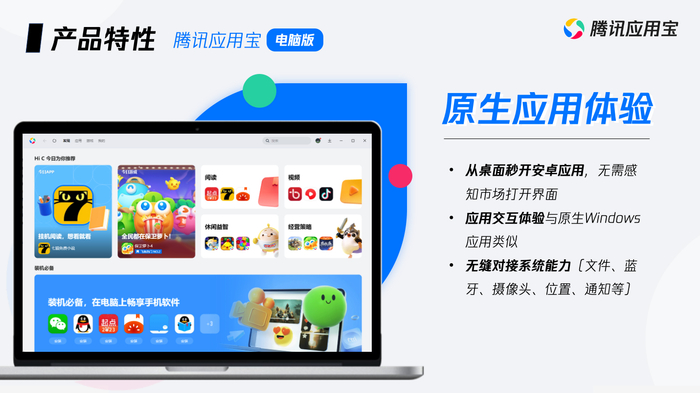 IT之家 6 月 3 日消息,腾讯应用开放平台公布了应用宝电脑版(后简称应用宝 PC 版)产品详情,产品特性介绍显示:腾讯移动应用引擎将采用 WSA 原生方案。