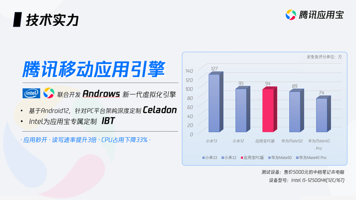 据介绍,腾讯移动应用引擎系应用宝研发团队与 Intel 合作开发的 Androws 新一代虚拟化引擎,基于 Android 12 系统,采用 WSA 原生方案,在技术上与传统模拟器差异较大。