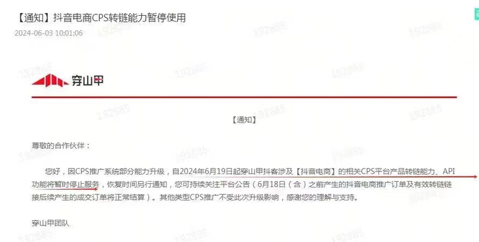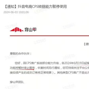 【亿邦原创】亿邦动力独家获悉,6月19日起,穿山甲抖客涉及抖音电商的相关CPS平台产品转链能力、API功能将停止服务;6月18日前产生的抖音电商相关推广订单和有效转链链接产生的订单将政策结算,其他类型的CPS推广不受此次调整影响。