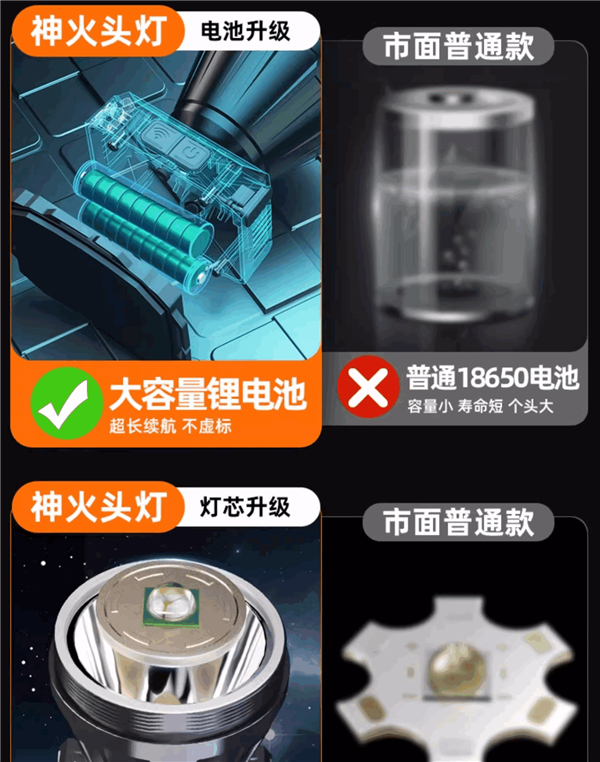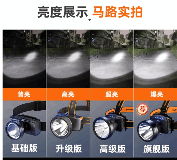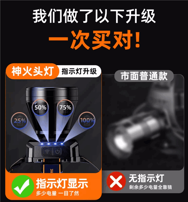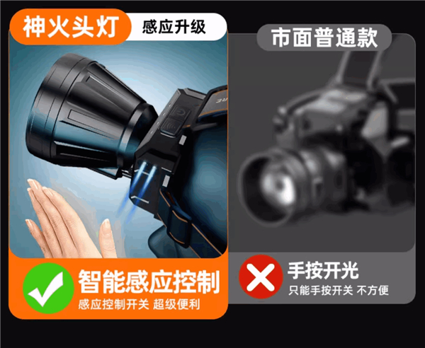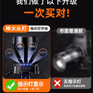 与市民普通款相比,神火头灯配备电量显示,电池、灯芯升级,照得更远更亮,开关还有感应按键,方便实用。