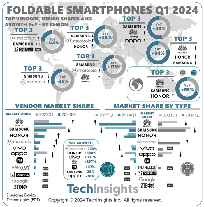 强大的研发实力做后盾,坚持创新突破和创新引领,让荣耀不断带来超越消费者期待的产品与体验,也建立起属于自己的高端产品节奏和高端品牌形象,在更广阔的舞台上与全球最顶级的品牌一决高下。市场调研机构Techinsights最新报告显示,2024年Q1,荣耀折叠屏市场份额在全球和西欧排名第三,在中国排名第二;横折折叠屏在全球和西欧、中国排名第二。