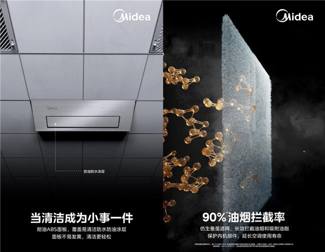 厨房油烟不仅让空调表面变得油腻不堪,带来清洗难题,还容易对空调内部造成损害,影响使用寿命。针对这一痛点,美的厨房空调特别采用了耐油ABS面板,减少发黄、触油开裂等问题。清洁起来就像擦桌子一样简单方便,让用户告别繁琐的清洁工作。此外,美的还在回风口处采用了高效的拦截滤网,有效拦截油烟,同时,其高防腐核心部件设计也保证了厨房空调在油烟潮湿环境下的稳定运行,让产品更长效耐用。