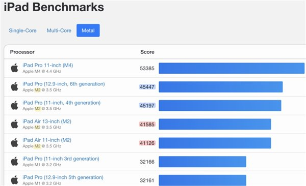 值得注意的是,GeekBench跑分显示,与搭载M2(10核GPU)的iPad Pro相比,M2版iPad Air GPU性能跑分低了约10%,两者差距可能与缺少的那颗核心有关。