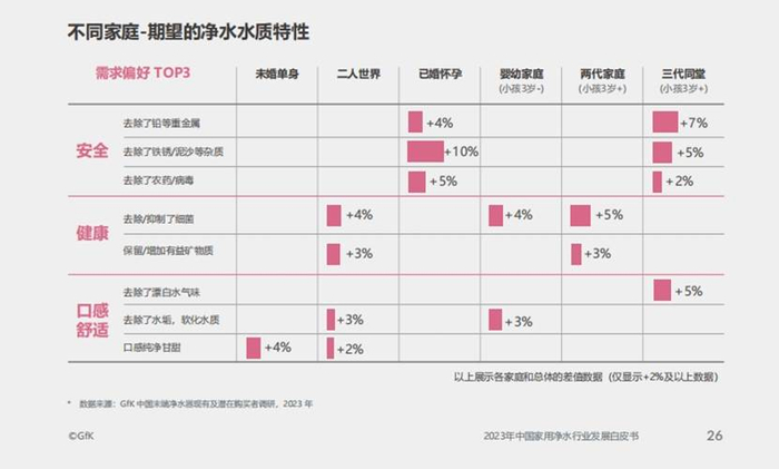 从当前中国家庭日常饮水生活需求来看,不同人群、饮水场景需求也有所不同。据《2023中国家用净水行业发展白皮书》显示,国人普遍爱喝“有温度的水”,女性喜欢喝45°左右的温水,占比为35%;男性、70后人群在热水泡茶或冲泡其他饮品方面占比达24%,高出其他年龄段人群,90后人群相对更喜欢喝冰水。此外,不同家庭成员对饮水,比如孕妇、婴儿更注重水质安全,有害物质的去除;比如成人、老人爱泡茶,较为注重水质健康,除了去除有害物质,还要保留有益矿物质。由此,不难看出,净水器行业升级改善水质的方向,去除有害物质之外,增加有益矿物质也是未来创新发展的新趋势。