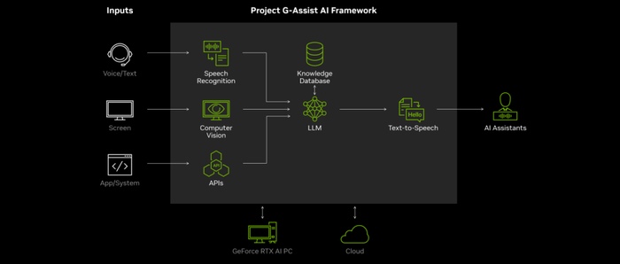 G-Assist是一个创新的AI助手,也像一个聪明的游戏伙伴。它通过接收玩家的语音、文本输入以及游戏窗口的截图,利用AI视觉模型分析内容,从而理解特定应用程序的上下文并提供个性化的响应。这些视觉模型与大型语言模型(LLM)相连,后者又与丰富的游戏知识数据库相连,能够根据游戏中的实际情况生成富有洞察力的文本或语音响应。开发者可以为特定游戏或应用定制G-Assist的视觉和语言模型,以实现更高的准确性和洞察力。