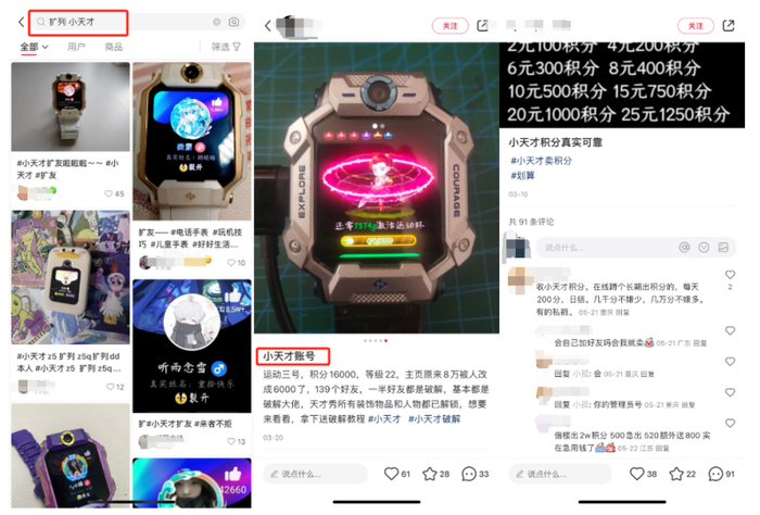 只要碰一碰手表,小天才用户就可以成为好友。成为好友之后,孩子们通过手表畅聊、相互给首页点赞——像QQ空间的星级一样,赞的数量某种程度上代表一种尊贵和能力。此外,通过社交、签到、运动等方式还能获取积分,积分可以用来购买表盘、兑换壁纸装饰等。在二手流通平台和其他社交软件上,小天才积分、权益卡和账号本身甚至可以明码交易。
