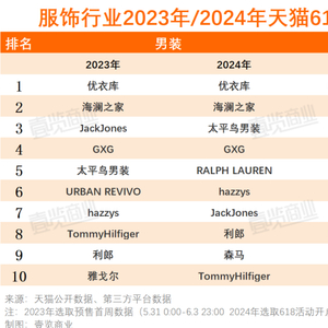 对比2023年来看,天猫的男装品牌榜单稳定性强于女装,这也显示了女装目前的竞争之激烈前所未有。在男装榜单上,优衣库、海澜之家、GXG排名位置都未发生变动,利郎、hazzys今年各前进一名,JackJones跌至第7,TommyHilfiger跌至第10,太平鸟男装上升至第3。仅有URBAN REVIVO、雅戈尔掉榜,由RALPH LAUREN、森马取而代之。