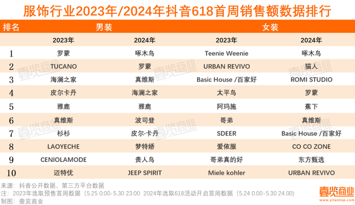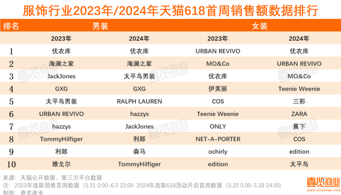在天猫首周服饰榜单,2023年男装及今年的男女装榜单都由优衣库登顶,亚军也较为稳定,2023年及2024年的男装都是海澜之家,2023年女装冠亚军URBAN REVIVO及MO&Co分别是今年的亚军及季军。