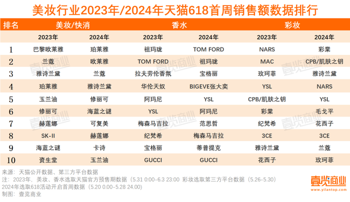 服饰和美妆,向来是各类大促竞争最激烈的两大品类。目前,天猫及抖音双渠道皆已开启618第一阶段大促。壹览商业整理了2023年及2024年,服饰、美妆大品类在天猫、抖音的618大促首周榜单,看看今年有哪些“黑马”在大促首周就突出重围,又有哪些品牌持续上榜?