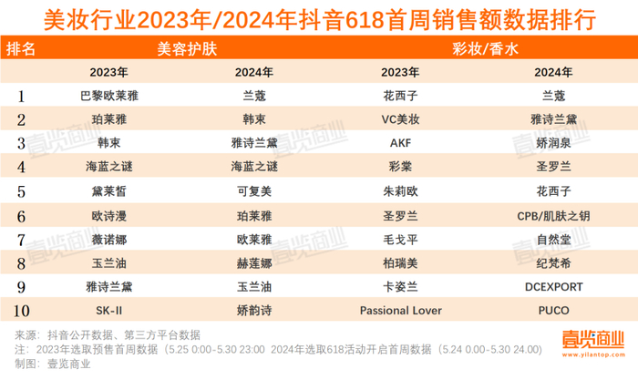 国际品牌兰蔻、雅诗兰黛显然今年以来更加重视了抖音平台的布局,兰蔻从2023年未上榜直接空降夺得今年618大促抖音首周美容护肤、彩妆/香水双冠军;雅诗兰黛排名大幅提升,在双榜单都位居前三。本身在抖音表现强劲的韩束排名依然稳定,从美容护肤榜单第三升至第二。