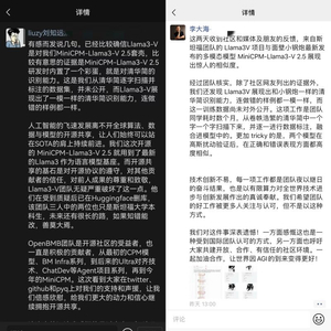 6月3日中午,面壁智能 CEO 李大海在其朋友圈发文称:“技术创新不易,每一项工作都是团队夜以继日的奋斗结果,也是以有限算力对全世界技术进步与创新发展作出的真诚奉献。我们希望团队的好工作被更多人关注与认可,但不是以这种方式。”,并且呼吁:“共建开放、合作、有信任的社区环境。加油合作,让世界因 AGI 的到来变得更好!”