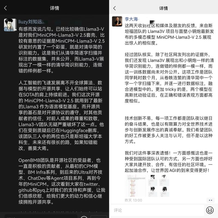 6月3日,面壁智能首席科学家、清华大学长聘副教授刘知远在知乎平台回应称:“已经比较确信Llama3-V是对我们MiniCPM-Llama3-V 2.5套壳,比较有意思的证据是MiniCPM-Llama3-V 2.5研发时内置了一个彩蛋,就是对清华简的识别能力。这是我们从清华简逐字扫描并标注的数据集,并未公开,而Llama3-V展现出了一模一样的清华简识别能力,连做错的样例都一样。”
