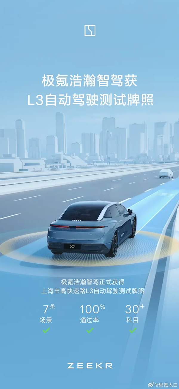 通过率100%!极氪浩瀚智驾获得L3自动驾驶测试牌照