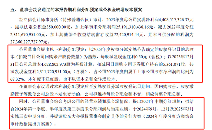 同时,雅戈尔董事会综合考虑公司的经营业绩和现金流情况,提出2024年中期分红规划:拟结合2024年第一季度、半年度及第三季度未分配利润与当期业绩,于2024年9月、12月及2025年3月实施三次中期分红,并提请股东大会授权董事会制定具体的分红方案(2024年年度分红方案结合审计数据提出并实施)。