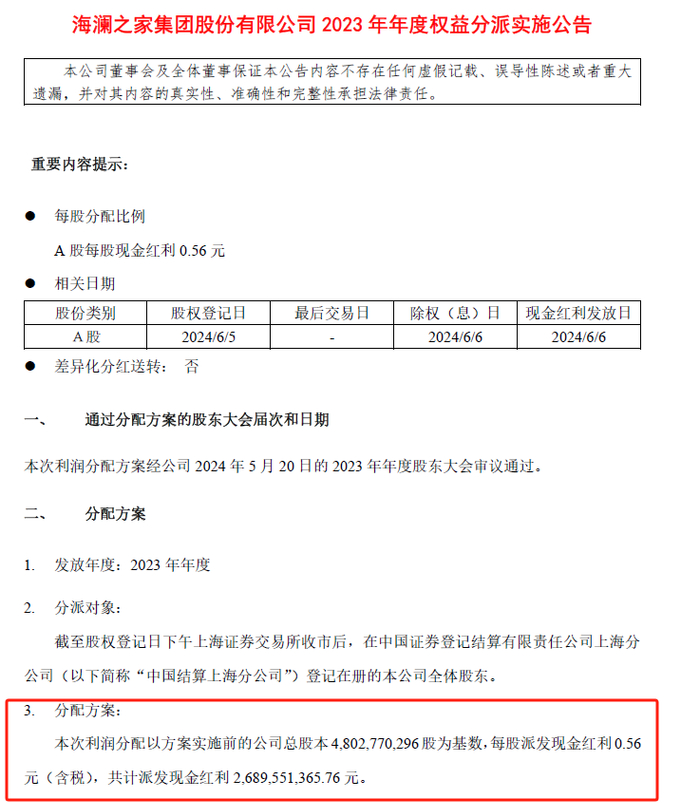海澜之家2023年年度权益分派实施公告显示,公司2023 年年度分配方案为:以方案实施前的公司总股本4,802,770,296股为基数,每股派发现金红利0.56 元(含税),共计派发现金红利 2,689,551,365.76 元。